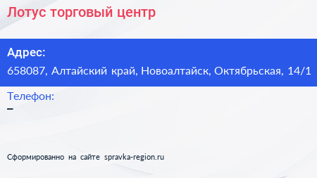 Лотус, торговый центр по адресу 658087, Алтайский край, Новоалтайск, Октябрьская, 14/1 в дальнейшем Организация, размещена в следующих категориях: