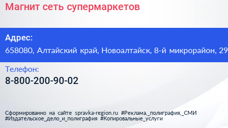 Магнит, сеть супермаркетов по адресу 658080, Алтайский край, Новоалтайск, 8-й микрорайон, 29 в дальнейшем Организация, размещена в следующих категориях: