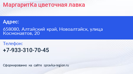 МаргаритКа, цветочная лавка по адресу 658080, Алтайский край, Новоалтайск, улица Космонавтов, 20 в дальнейшем Организация, размещена в следующих категориях: