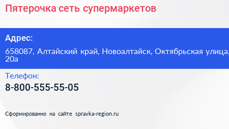 Пятерочка, сеть супермаркетов по адресу 658087, Алтайский край, Новоалтайск, Октябрьская улица, 20а в дальнейшем Организация, размещена в следующих категориях:
