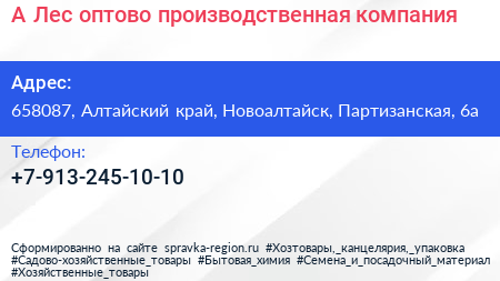 А-Лес, оптово-производственная компания по адресу 658087, Алтайский край, Новоалтайск, Партизанская, 6а в дальнейшем Организация, размещена в следующих категориях: