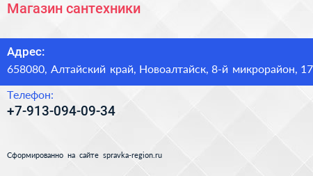 Магазин сантехники по адресу 658080, Алтайский край, Новоалтайск, 8-й микрорайон, 17 в дальнейшем Организация, размещена в следующих категориях: