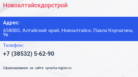 Новоалтайскдорстрой по адресу 658083, Алтайский край, Новоалтайск, Павла Корчагина, 9в в дальнейшем Организация, размещена в следующих категориях: