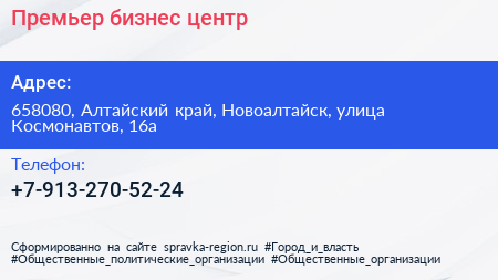 Премьер, бизнес-центр по адресу 658080, Алтайский край, Новоалтайск, улица Космонавтов, 16а в дальнейшем Организация, размещена в следующих категориях: