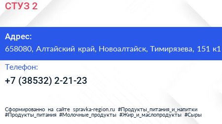 СТУЗ-2 по адресу 658080, Алтайский край, Новоалтайск, Тимирязева, 151 к1 в дальнейшем Организация, размещена в следующих категориях:
