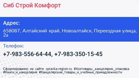 Сиб-Строй-Комфорт по адресу 658087, Алтайский край, Новоалтайск, Переездная улица, 2а в дальнейшем Организация, размещена в следующих категориях: