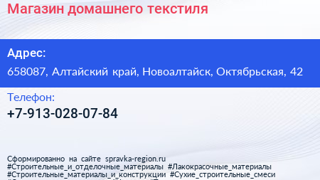 Магазин домашнего текстиля по адресу 658087, Алтайский край, Новоалтайск, Октябрьская, 42 в дальнейшем Организация, размещена в следующих категориях: