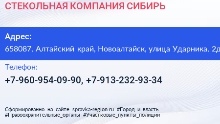 СТЕКОЛЬНАЯ КОМПАНИЯ СИБИРЬ по адресу 658087, Алтайский край, Новоалтайск, улица Ударника, 2д в дальнейшем Организация, размещена в следующих категориях: