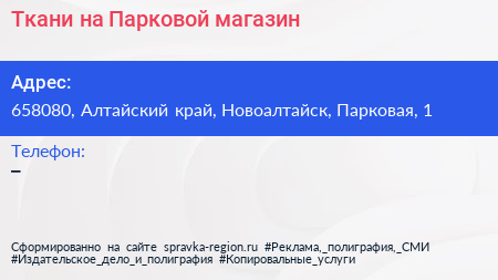 Ткани на Парковой, магазин по адресу 658080, Алтайский край, Новоалтайск, Парковая, 1 в дальнейшем Организация, размещена в следующих категориях: