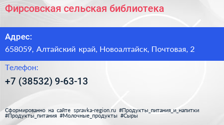 Фирсовская сельская библиотека по адресу 658059, Алтайский край, Новоалтайск, Почтовая, 2 в дальнейшем Организация, размещена в следующих категориях: