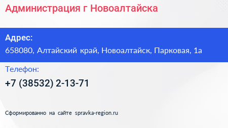 Администрация г. Новоалтайска по адресу 658080, Алтайский край, Новоалтайск, Парковая, 1а в дальнейшем Организация, размещена в следующих категориях: