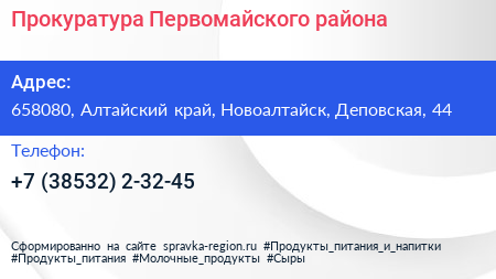 Прокуратура Первомайского района по адресу 658080, Алтайский край, Новоалтайск, Деповская, 44 в дальнейшем Организация, размещена в следующих категориях: