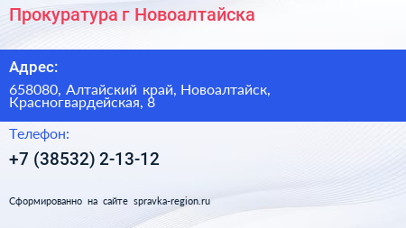 Прокуратура г. Новоалтайска по адресу 658080, Алтайский край, Новоалтайск, Красногвардейская, 8 в дальнейшем Организация, размещена в следующих категориях:
