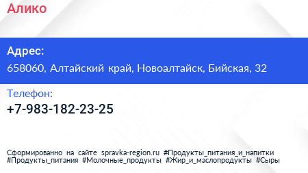 Алико по адресу 658060, Алтайский край, Новоалтайск, Бийская, 32 в дальнейшем Организация, размещена в следующих категориях: