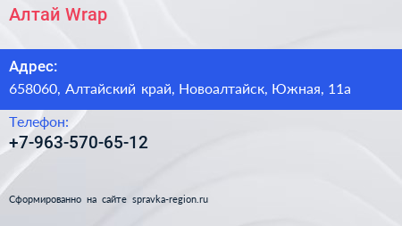 Алтай-Wrap по адресу 658060, Алтайский край, Новоалтайск, Южная, 11а в дальнейшем Организация, размещена в следующих категориях: