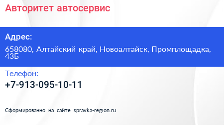 Авторитет, автосервис по адресу 658080, Алтайский край, Новоалтайск, Промплощадка, 43Б в дальнейшем Организация, размещена в следующих категориях: