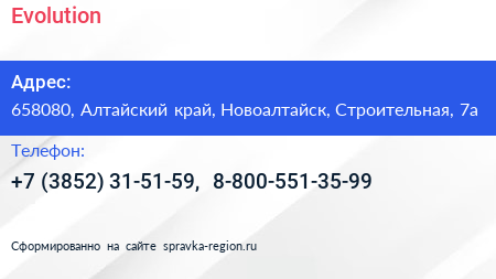 Evolution по адресу 658080, Алтайский край, Новоалтайск, Строительная, 7а в дальнейшем Организация, размещена в следующих категориях: