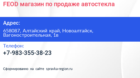 FEOD, магазин по продаже автостекла по адресу 658087, Алтайский край, Новоалтайск, Вагоностроительная, 1в в дальнейшем Организация, размещена в следующих категориях: