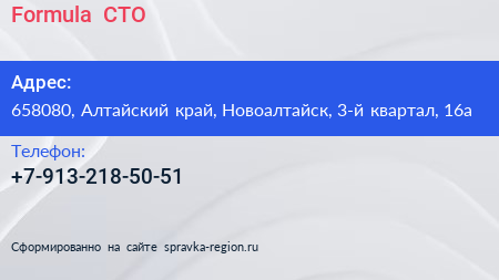 Formula+, СТО по адресу 658080, Алтайский край, Новоалтайск, 3-й квартал, 16а в дальнейшем Организация, размещена в следующих категориях: