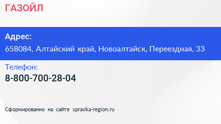 ГАЗОЙЛ по адресу 658084, Алтайский край, Новоалтайск, Переездная, 33 в дальнейшем Организация, размещена в следующих категориях: