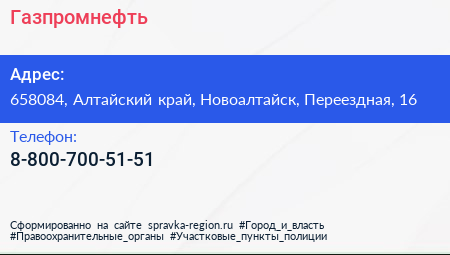 Газпромнефть по адресу 658084, Алтайский край, Новоалтайск, Переездная, 16 в дальнейшем Организация, размещена в следующих категориях:
