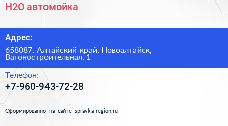 H2O, автомойка по адресу 658087, Алтайский край, Новоалтайск, Вагоностроительная, 1 в дальнейшем Организация, размещена в следующих категориях: