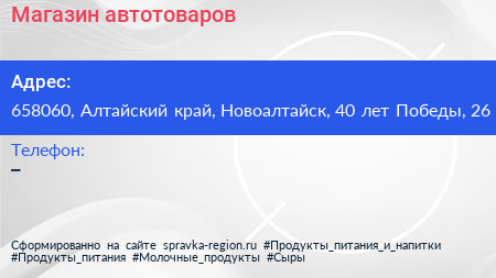 Магазин автотоваров по адресу 658060, Алтайский край, Новоалтайск, 40 лет Победы, 26 в дальнейшем Организация, размещена в следующих категориях: