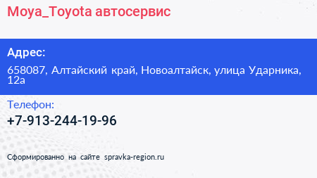 Moya_Toyota, автосервис по адресу 658087, Алтайский край, Новоалтайск, улица Ударника, 12а в дальнейшем Организация, размещена в следующих категориях: