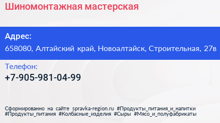 Шиномонтажная мастерская по адресу 658080, Алтайский край, Новоалтайск, Строительная, 27в в дальнейшем Организация, размещена в следующих категориях: