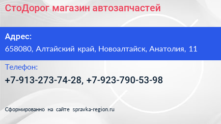 СтоДорог, магазин автозапчастей по адресу 658080, Алтайский край, Новоалтайск, Анатолия, 11 в дальнейшем Организация, размещена в следующих категориях: