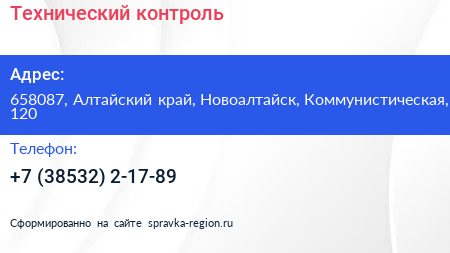 Технический контроль по адресу 658087, Алтайский край, Новоалтайск, Коммунистическая, 120 в дальнейшем Организация, размещена в следующих категориях: