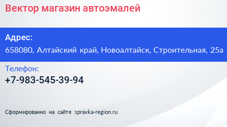 Вектор, магазин автоэмалей по адресу 658080, Алтайский край, Новоалтайск, Строительная, 25а в дальнейшем Организация, размещена в следующих категориях: