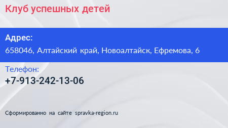 Клуб успешных детей по адресу 658046, Алтайский край, Новоалтайск, Ефремова, 6 в дальнейшем Организация, размещена в следующих категориях: