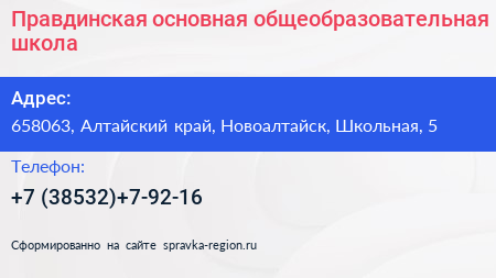 Правдинская основная общеобразовательная школа по адресу 658063, Алтайский край, Новоалтайск, Школьная, 5 в дальнейшем Организация, размещена в следующих категориях: