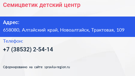 Семицветик, детский центр по адресу 658080, Алтайский край, Новоалтайск, Трактовая, 109 в дальнейшем Организация, размещена в следующих категориях: