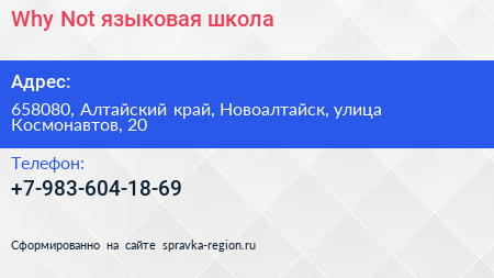 Why Not, языковая школа по адресу 658080, Алтайский край, Новоалтайск, улица Космонавтов, 20 в дальнейшем Организация, размещена в следующих категориях: