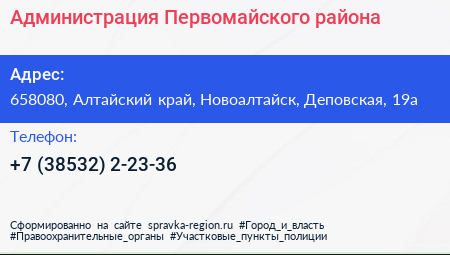 Администрация Первомайского района по адресу 658080, Алтайский край, Новоалтайск, Деповская, 19а в дальнейшем Организация, размещена в следующих категориях: