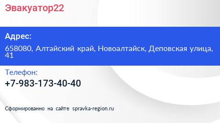 Эвакуатор22 по адресу 658080, Алтайский край, Новоалтайск, Деповская улица, 41 в дальнейшем Организация, размещена в следующих категориях: