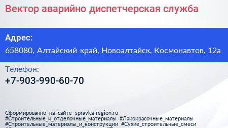 Вектор, аварийно-диспетчерская служба по адресу 658080, Алтайский край, Новоалтайск, Космонавтов, 12а в дальнейшем Организация, размещена в следующих категориях: