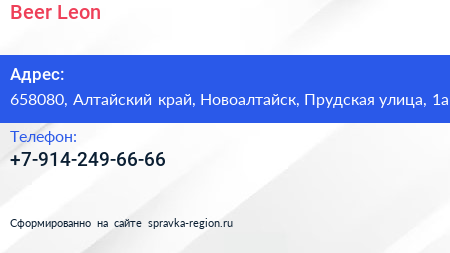 Beer Leon по адресу 658080, Алтайский край, Новоалтайск, Прудская улица, 1а в дальнейшем Организация, размещена в следующих категориях: