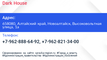 Dark House по адресу 658080, Алтайский край, Новоалтайск, Высоковольтная улица, 1а в дальнейшем Организация, размещена в следующих категориях:
