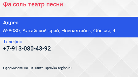 Фа-соль, театр песни по адресу 658080, Алтайский край, Новоалтайск, Обская, 4 в дальнейшем Организация, размещена в следующих категориях: