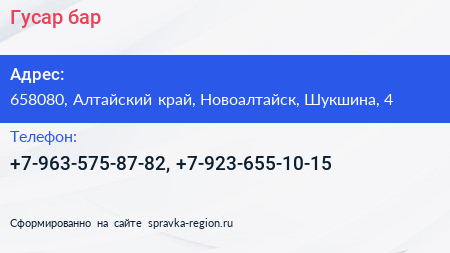 Гусар, бар по адресу 658080, Алтайский край, Новоалтайск, Шукшина, 4 в дальнейшем Организация, размещена в следующих категориях: