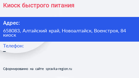 Киоск быстрого питания по адресу 658083, Алтайский край, Новоалтайск, Военстроя, 84 киоск в дальнейшем Организация, размещена в следующих категориях: