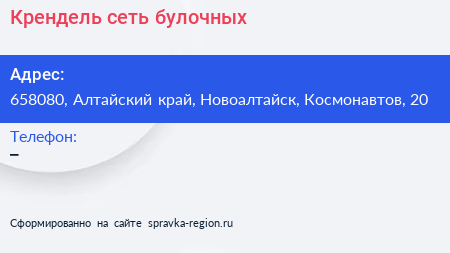 Крендель, сеть булочных по адресу 658080, Алтайский край, Новоалтайск, Космонавтов, 20 в дальнейшем Организация, размещена в следующих категориях: