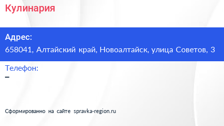 Кулинария по адресу 658041, Алтайский край, Новоалтайск, улица Советов, 3 в дальнейшем Организация, размещена в следующих категориях: