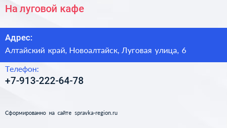 На луговой, кафе по адресу Алтайский край, Новоалтайск, Луговая улица, 6 в дальнейшем Организация, размещена в следующих категориях: