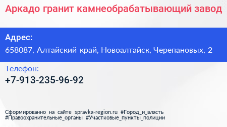 Аркадо-гранит, камнеобрабатывающий завод по адресу 658087, Алтайский край, Новоалтайск, Черепановых, 2 в дальнейшем Организация, размещена в следующих категориях: