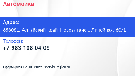 Автомойка по адресу 658081, Алтайский край, Новоалтайск, Линейная, 60/1 в дальнейшем Организация, размещена в следующих категориях: