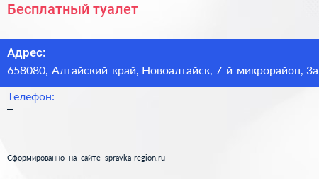 Бесплатный туалет по адресу 658080, Алтайский край, Новоалтайск, 7-й микрорайон, 3а в дальнейшем Организация, размещена в следующих категориях: